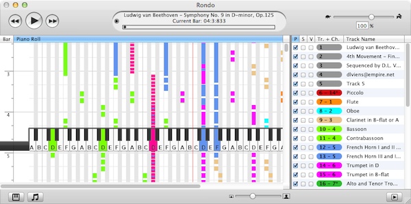 Rondo is a unique MIDI player designed to help you follow your music as it plays. Its vertical scrolling piano roll, horizontal live playing keyboard and visual track filtering help you focus on just part of the melody so you can study or play along.